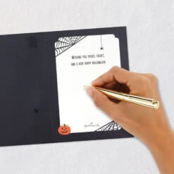 Pop-up Halloween greeting card features a creepy scene of a spiderweb-covered graveyard and pumpkins with a light-up backdrop set in a three-dimensional, laser-cut diorama. Musical card plays a spooky song and lights up when button on front is pressed. Delicate die-cut details adorn the sides to extend the shadow box scene and create a fun display from any angle. Simply unfold the card to create a peek-through shadow box display—no assembly required. When open for display, 3D pop-up card measures approx. 6.25″ H.