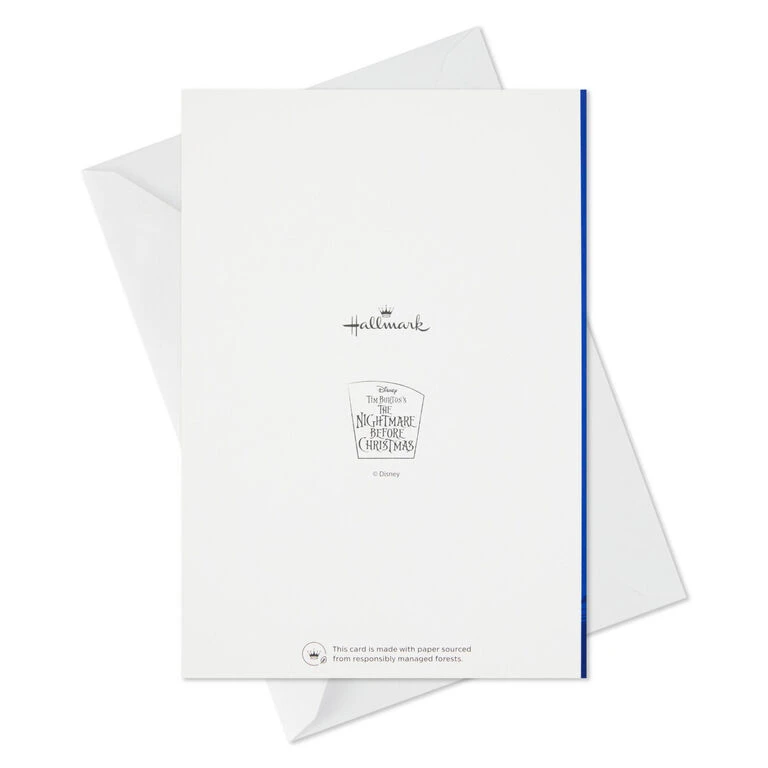 Boxed cards feature a fun design of Jack Skellington and his pet dog Zero on a blue background with bats flying overhead, Oogie Boogie’s henchmen in the background and a pile of hard candy in the corner of the graveyard gate. This pack of cards is perfect for sharing birthday, Halloween or holiday wishes with friends, family and fans of the Tim Burton classic.